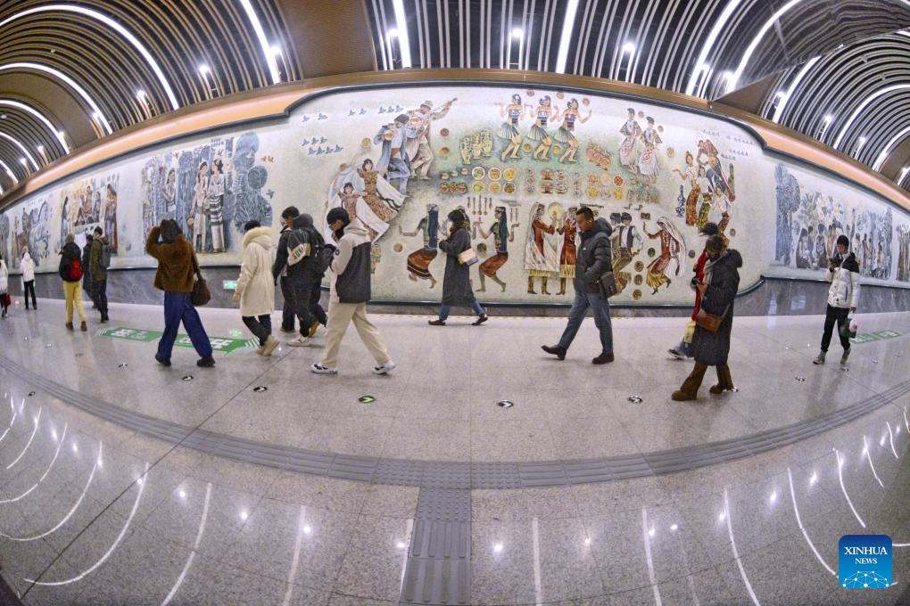 This photo taken on Jan. 4, 2025 shows murals at Niujie Station on Beijing Subway Line 19 in Beijing, capital of China. (Xinhua/Li Xin)