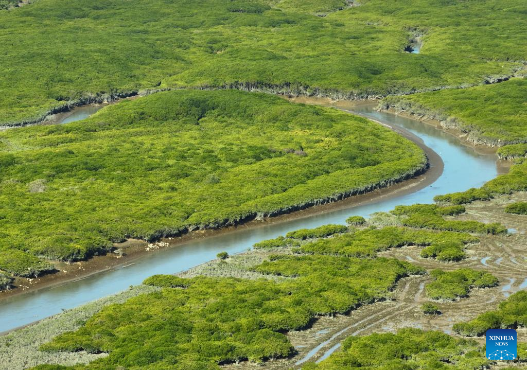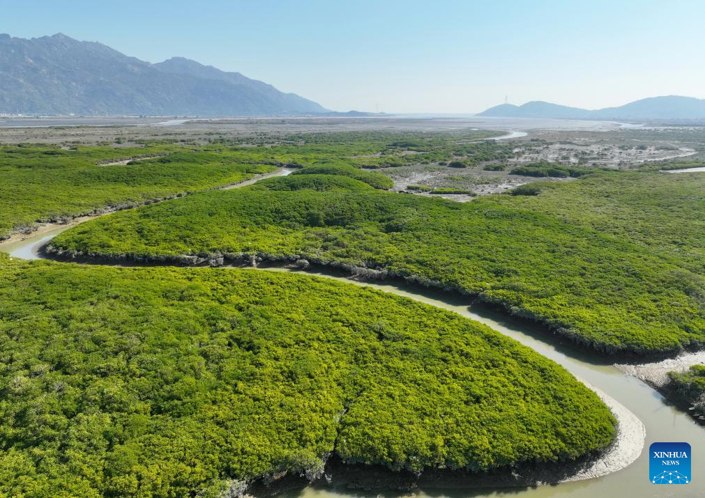 An aerial drone photo taken on Jan. 4, 2025 shows a view of the Zhangjiangkou National Mangrove Nature Reserve in Yunxiao County, southeast China's Fujian Province. Located in the estuary of the Zhangjiang river, the Zhangjiangkou National Mangrove Nature Reserve covers an area of 2,360 hectares. It was listed as one of the Wetlands of International Importance under the Ramsar Convention on Wetlands in 2008. (Xinhua/Lin Shanchuan)