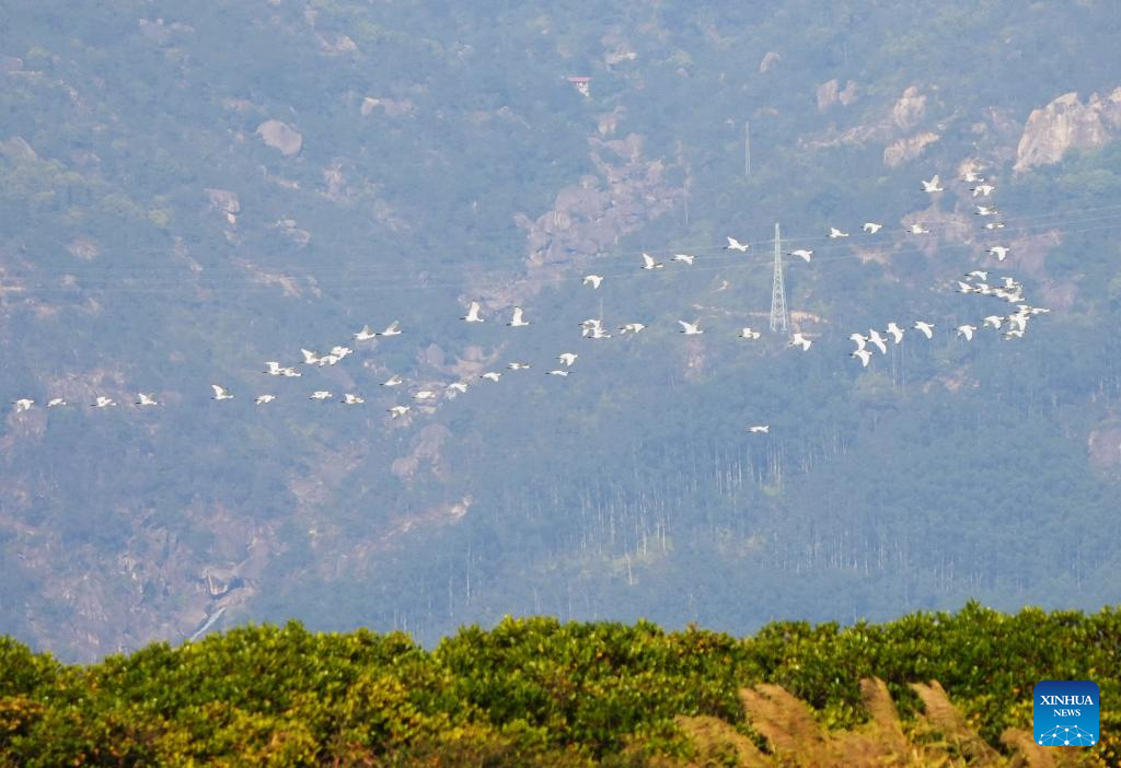 A drone photo taken on Jan. 4, 2025 shows birds flying at the Zhangjiangkou National Mangrove Nature Reserve in Yunxiao County, southeast China's Fujian Province. Located in the estuary of the Zhangjiang river, the Zhangjiangkou National Mangrove Nature Reserve covers an area of 2,360 hectares. It was listed as one of the Wetlands of International Importance under the Ramsar Convention on Wetlands in 2008. (Xinhua/Lin Shanchuan)