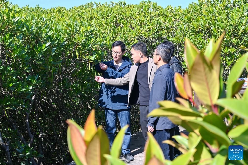 A staff member (1st L) briefs visitors on plants at the Zhangjiangkou National Mangrove Nature Reserve in Yunxiao County, southeast China's Fujian Province, Jan. 4, 2025. Located in the estuary of the Zhangjiang river, the Zhangjiangkou National Mangrove Nature Reserve covers an area of 2,360 hectares. It was listed as one of the Wetlands of International Importance under the Ramsar Convention on Wetlands in 2008. (Xinhua/Lin Shanchuan)