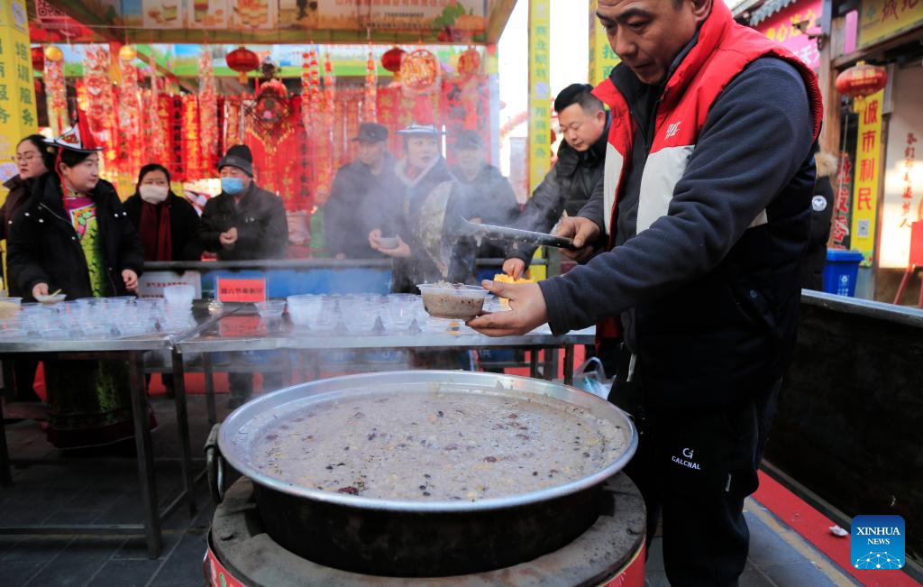 A staff member serves free Laba porridge for citizens at a market in Ganzhou District of Zhangye, northwest China's Gansu Province, Jan. 6, 2025. Various activities were held across the country to welcome the upcoming Laba Festival that falls on Jan. 7 this year. (Photo by Chen Li/Xinhua)