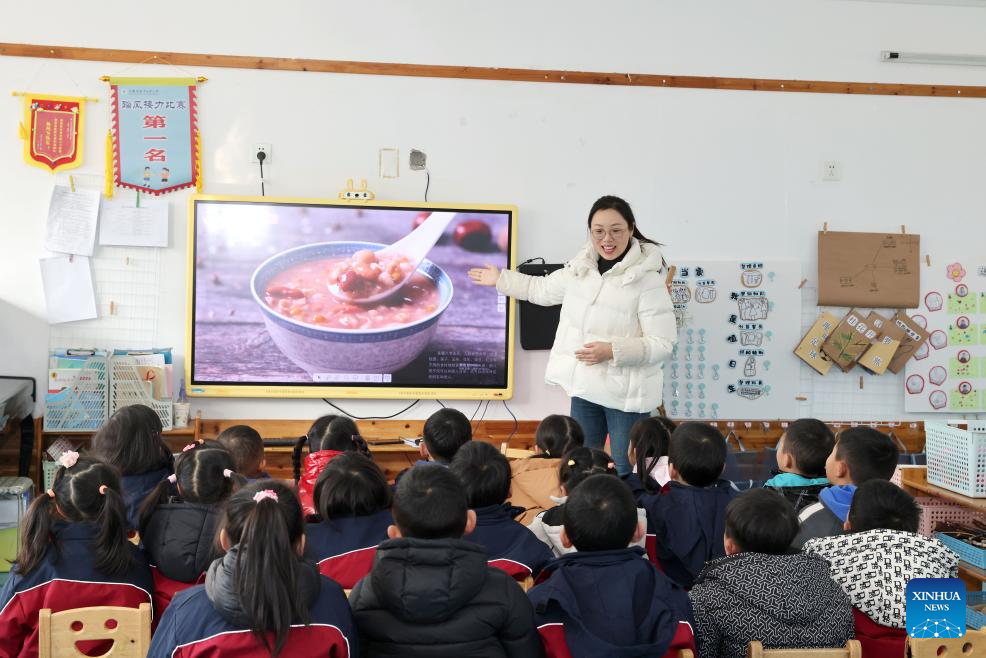 A teacher explains the knowledge of making Laba porridge to children at a kindergarten in Huai'an, east China's Jiangsu Province, Jan. 6, 2025. Various activities were held across the country to welcome the upcoming Laba Festival that falls on Jan. 7 this year. (Photo by Yin Chao/Xinhua)
