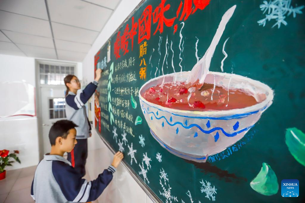 Students draw festive patterns on a blackboard at a middle school in Zunhua, north China's Hebei Province, Jan. 6, 2025. Various activities were held across the country to welcome the upcoming Laba Festival that falls on Jan. 7 this year. (Photo by Liu Mancang/Xinhua)