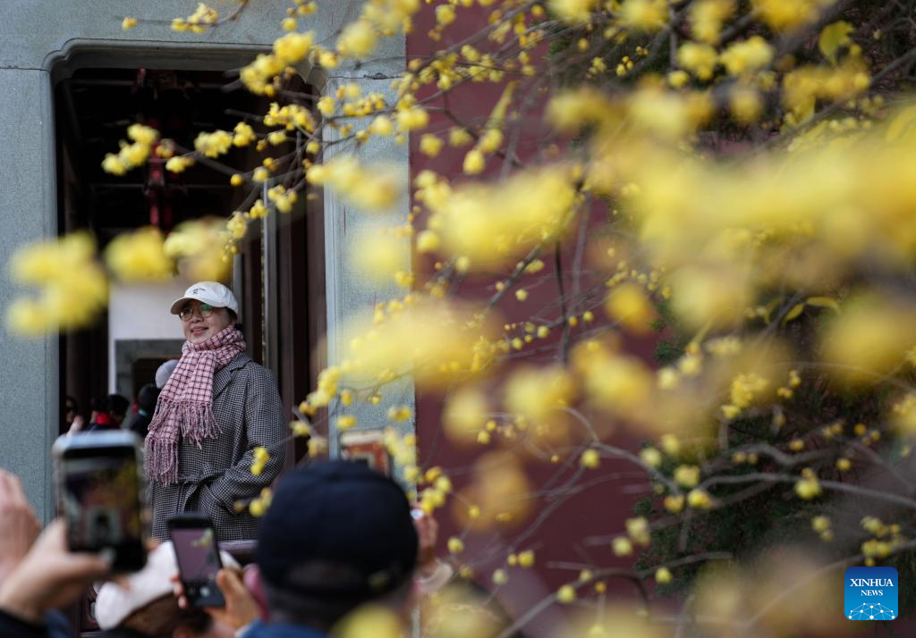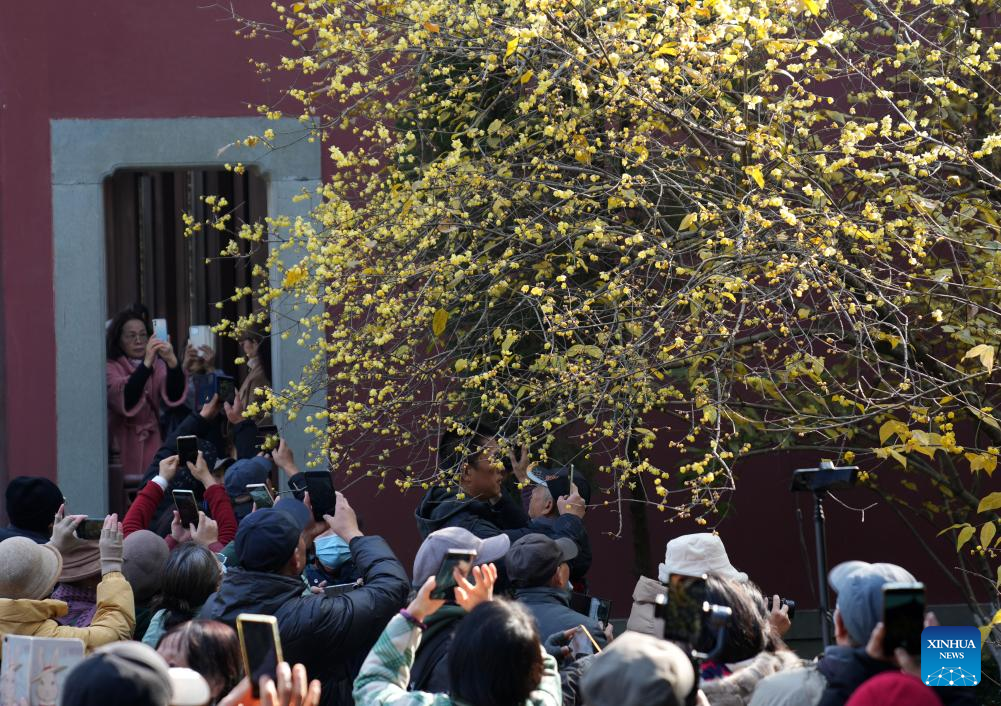 Visitors take photos of wintersweet flowers at a temple in Hangzhou, east China's Zhejiang Province, Jan. 6, 2025. (Xinhua/Han Chuanhao)