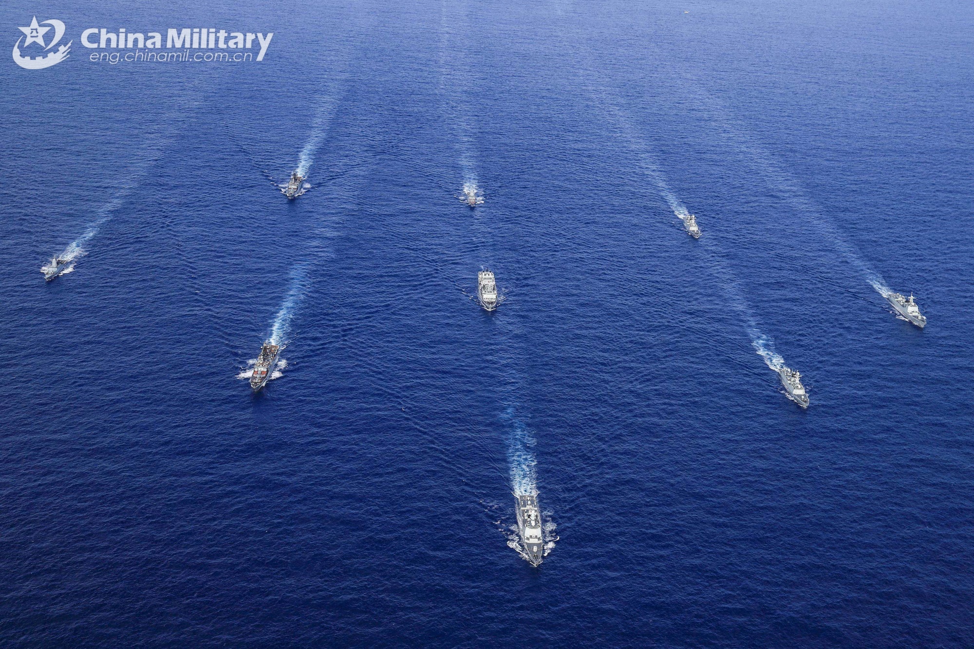 The picture shows naval vessels attached to a flotilla under the navy of the Chinese PLA Northern Theater Command sailing in formation during a maritime training exercise. It's learned that for the past few years, ships attached to the naval flotilla have visited more than 30 countries, and traveled to nine important international straits on five continents and three oceans, fully demonstrating the open, confident, friendly, and cooperative image of the Chinese PLA Navy.