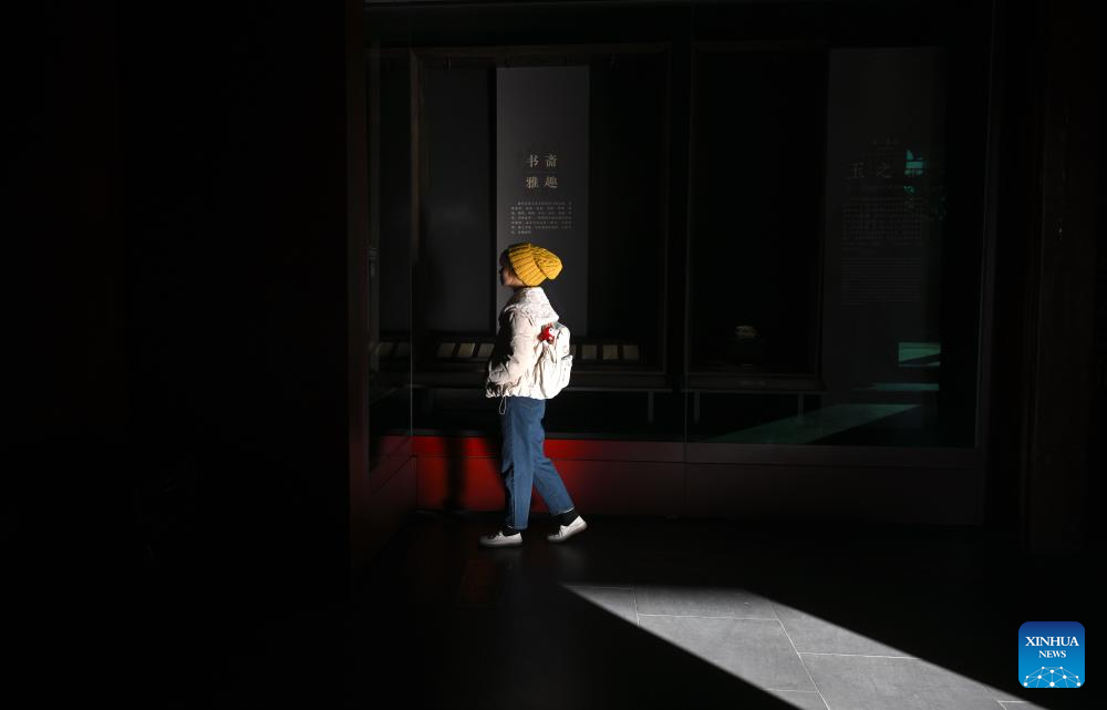 A visitor is seen at the exhibition titled "Jade from the Kunlun Mountains: Special Exhibition on Hetian Jade Culture in the Qing Court" at the Palace Museum in Beijing, capital of China, Jan. 6, 2025. The exhibition, which opened here on Monday, showcases 258 pieces of Hetian jade items from the Qing Court. (Xinhua/Jin Liangkuai)