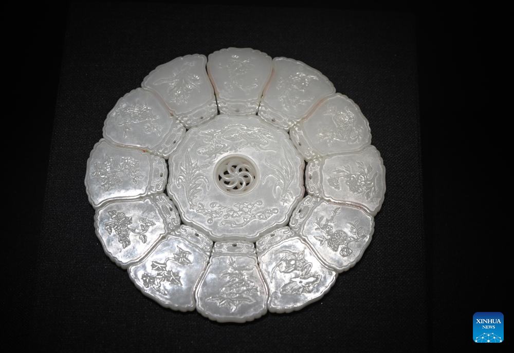 This photo shows a jade artifact at the exhibition titled "Jade from the Kunlun Mountains: Special Exhibition on Hetian Jade Culture in the Qing Court" at the Palace Museum in Beijing, capital of China, Jan. 6, 2025. The exhibition, which opened here on Monday, showcases 258 pieces of Hetian jade items from the Qing Court. (Xinhua/Jin Liangkuai)