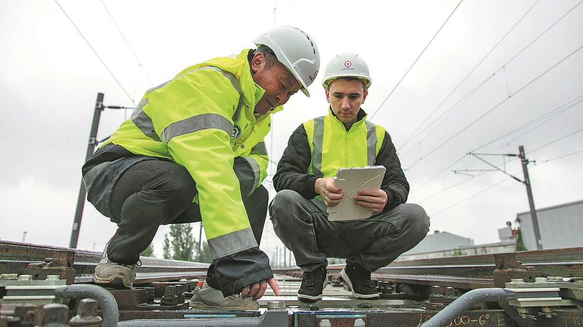 Chinese and local engineers inspect a construction site of the Serbian segment of the Belgrade-Budapest Railway, in Novi Sad, Serbia, on Sept 16. (Wang Wei/Xinhua)