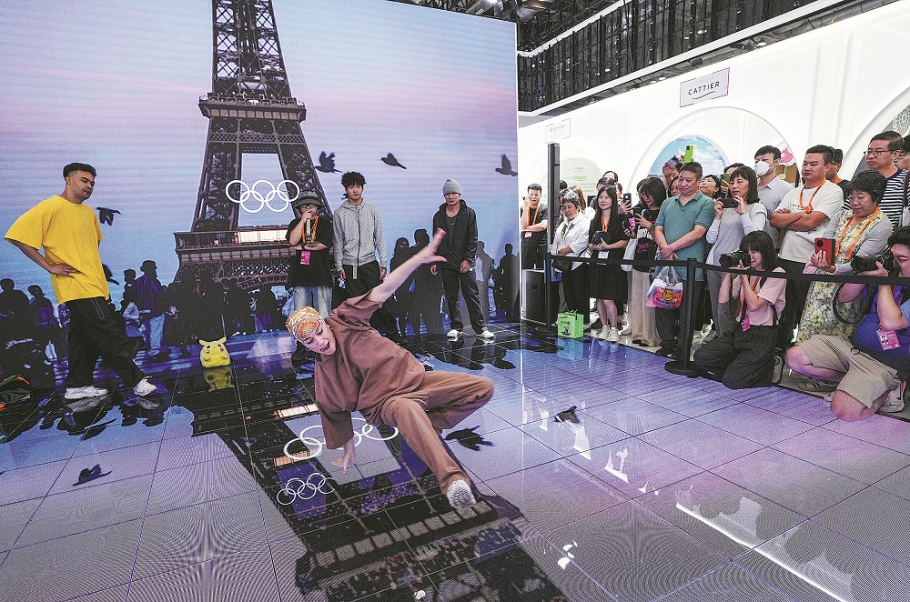 A performer breakdances at the national pavilion of France during the 2024 China International Fair for Trade in Services in Beijing on Sept 14. (Chen Yehua/Xinhua)