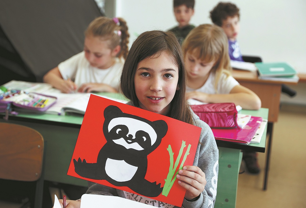 A student at the Hungarian-Chinese bilingual school in Budapest shows her painting of a giant panda on May 3. (Zhao Dingzhe/Xinhua)