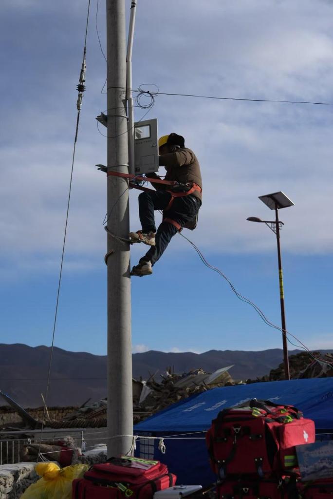 A staff member repairs electrical facilities at a village in Dingri County in Xigaze, southwest China's Xizang Autonomous Region, Jan. 7, 2025. (Xinhua/Jigme Dorje)
