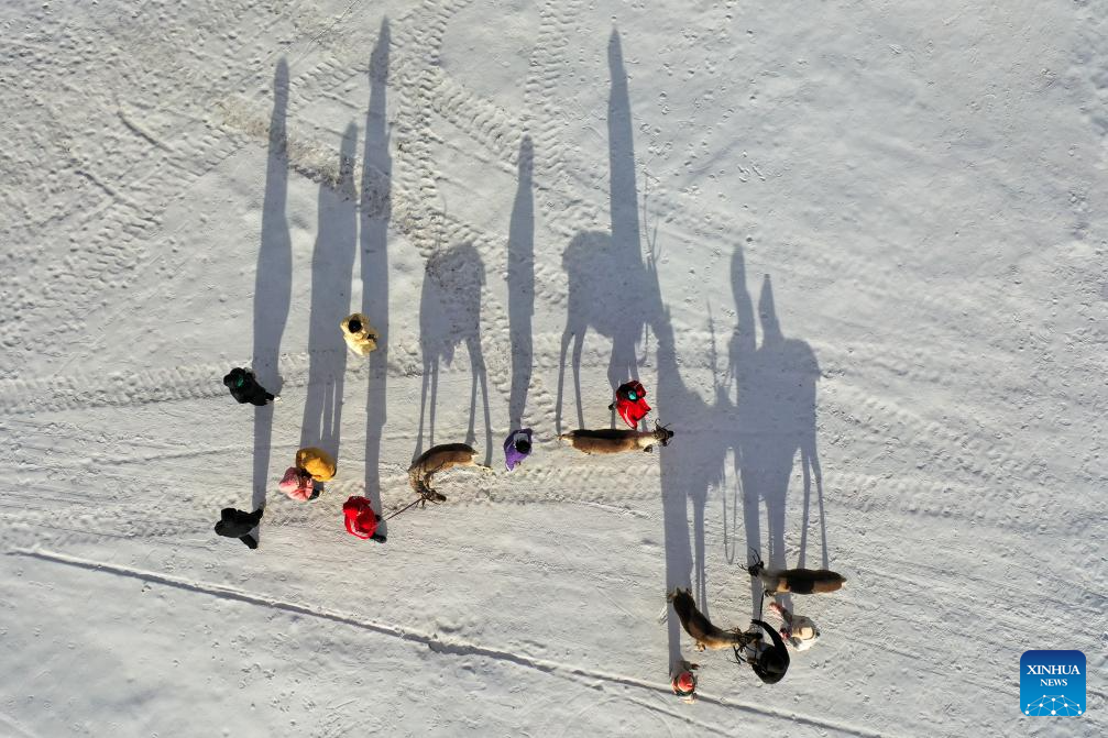 An aerial drone photo taken on Jan. 7 shows tourists visiting an ice and snow park by the Daheihe River in Hohhot, north China's Inner Mongolia Autonomous Region. (Xinhua/Li Zhipeng)