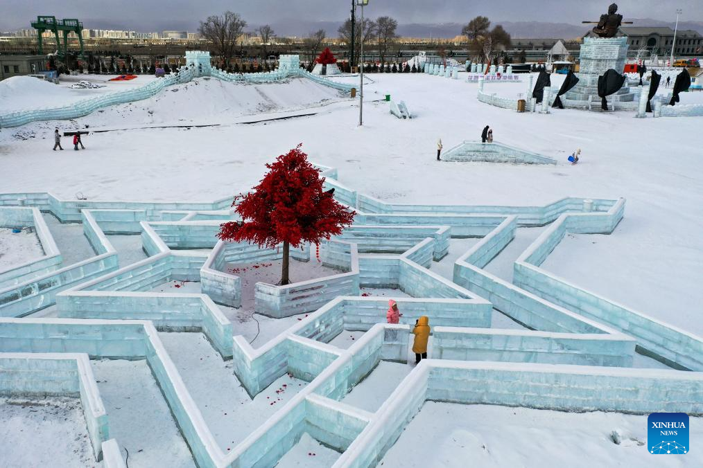 An aerial drone photo taken on Jan. 7 shows tourists visiting a labyrinth at an ice and snow park by the Daheihe River in Hohhot, north China's Inner Mongolia Autonomous Region. (Xinhua/Li Zhipeng)