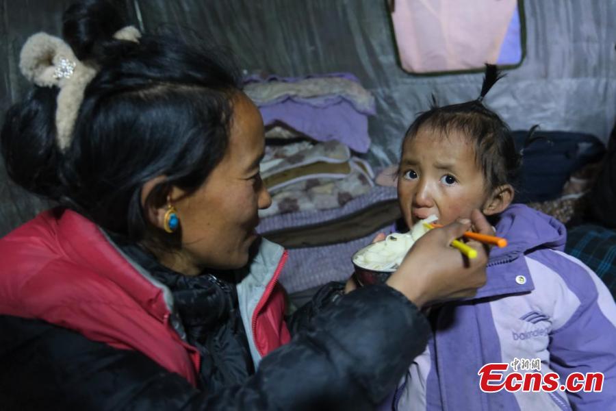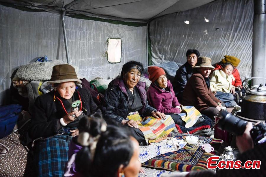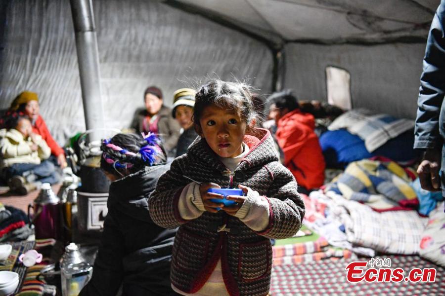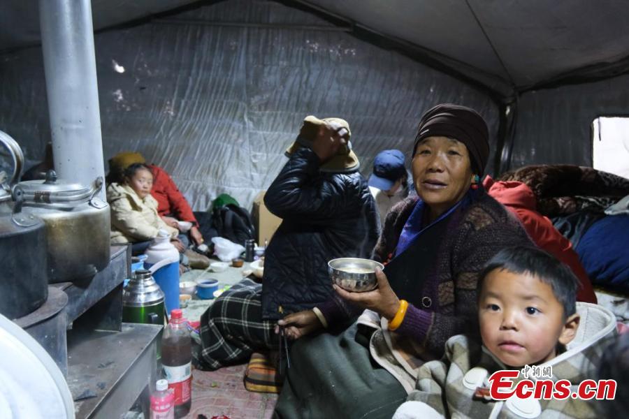 Earthquake-affected residents have dinner in a tent in Lhaze County in Xigaze, southwest China's Xizang Autonomous Region, Jan. 7, 2025. (Photo/China News Service)
