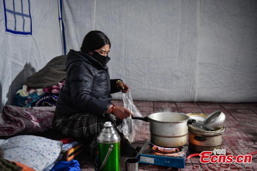 Earthquake-affected residents cook dinner in a tent in Lhaze County in Xigaze, southwest China's Xizang Autonomous Region, Jan. 7, 2025. (Photo/China News Service)