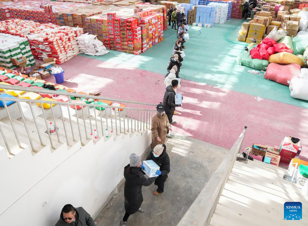 People relay relief materials in Dingri County in Xigaze City, southwest China's Xizang Autonomous Region, Jan. 8, 2025. Rescue and relief efforts were made after a 6.8-magnitude earthquake struck Dingri County in southwest China's Xizang Autonomous Region on Jan. 7. (Xinhua/Ding Ting)
