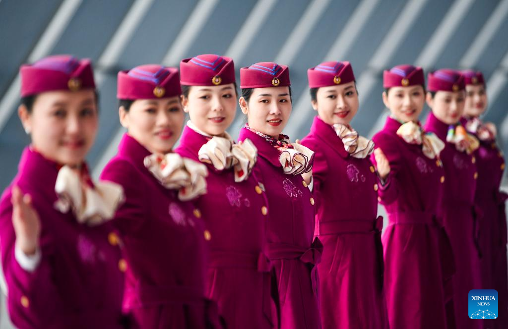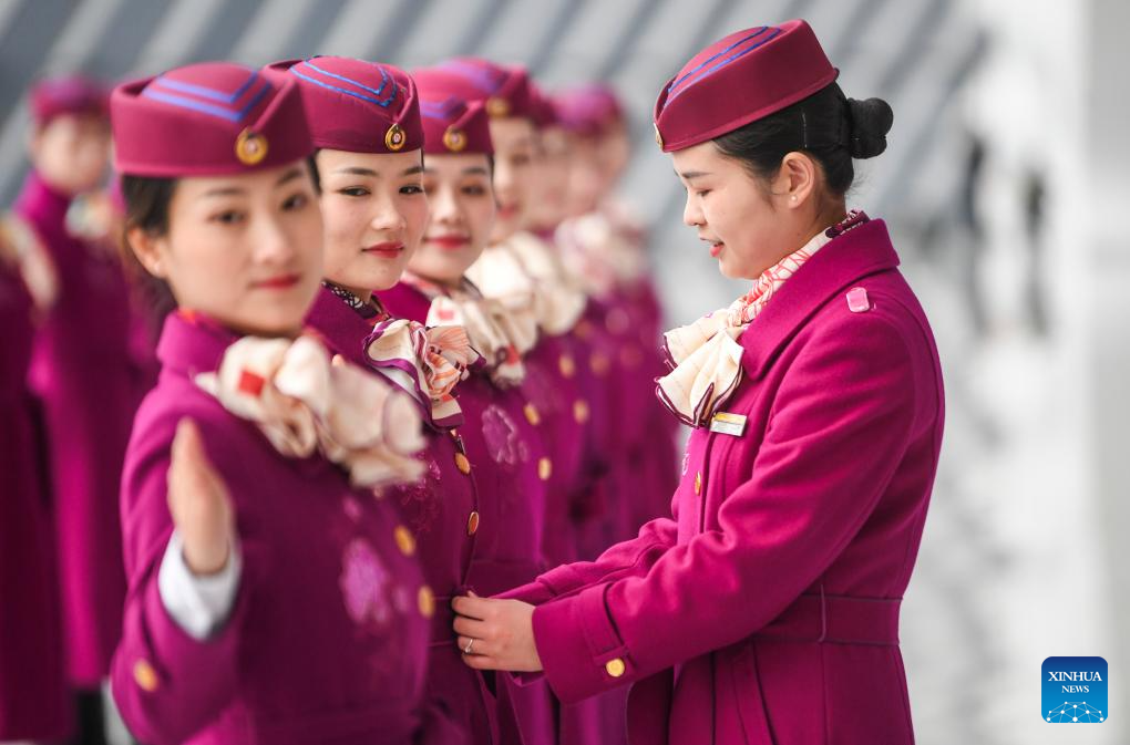 High-speed railway crew members take part in an etiquette training in Chongqing, southwest China, Jan. 8, 2025. The Chongqing branch of China Railway Chengdu Bureau Group Co., Ltd. organized training programs for high-speed railway crew members to improve service quality and prepare for the upcoming Spring Festival travel rush. (Xinhua/Wang Quanchao)