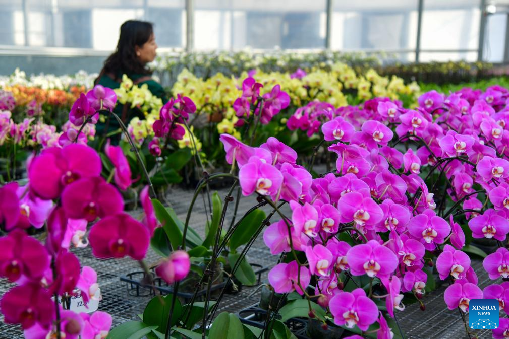 This photo taken on Jan. 8, 2025 shows butterfly orchids at a greenhouse in Boshan District, Zibo City of east China's Shandong Province. Flower growers in Boshan District are preparing for the peak sales season during the holidays. In recent years, Boshan has introduced leading floral production enterprises to cultivate butterfly orchids and other flowers. (Xinhua/Zhu Zheng)