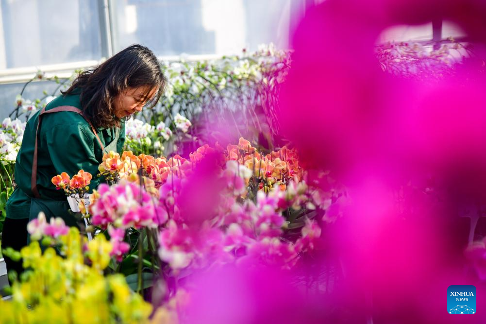 A worker checks butterfly orchids at a greenhouse in Boshan District, Zibo City of east China's Shandong Province, Jan. 8, 2025. Flower growers in Boshan District are preparing for the peak sales season during the holidays. In recent years, Boshan has introduced leading floral production enterprises to cultivate butterfly orchids and other flowers. (Xinhua/Zhu Zheng)