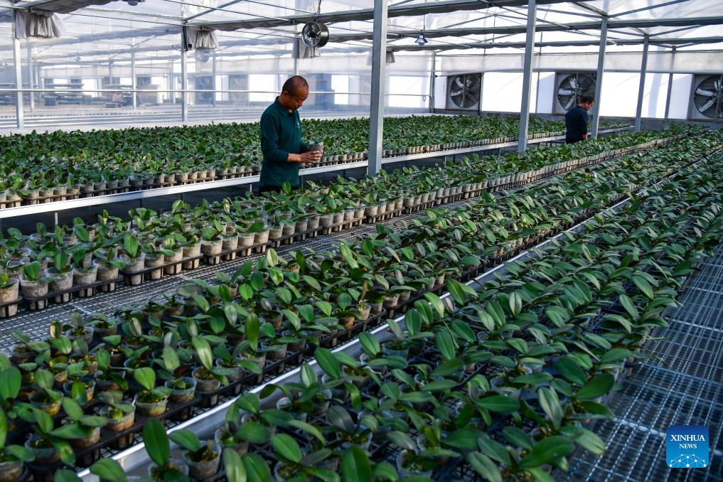 A worker checks seedlings at a greenhouse in Boshan District, Zibo City of east China's Shandong Province, Jan. 8, 2025. Flower growers in Boshan District are preparing for the peak sales season during the holidays. In recent years, Boshan has introduced leading floral production enterprises to cultivate butterfly orchids and other flowers. (Xinhua/Zhu Zheng)