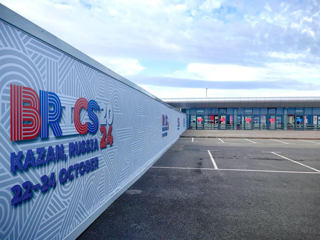 This photo taken on Oct. 23, 2024 shows the logo of the 16th BRICS Summit at the press center of the summit in Kazan, Russia. (Xinhua/Shen Hong)