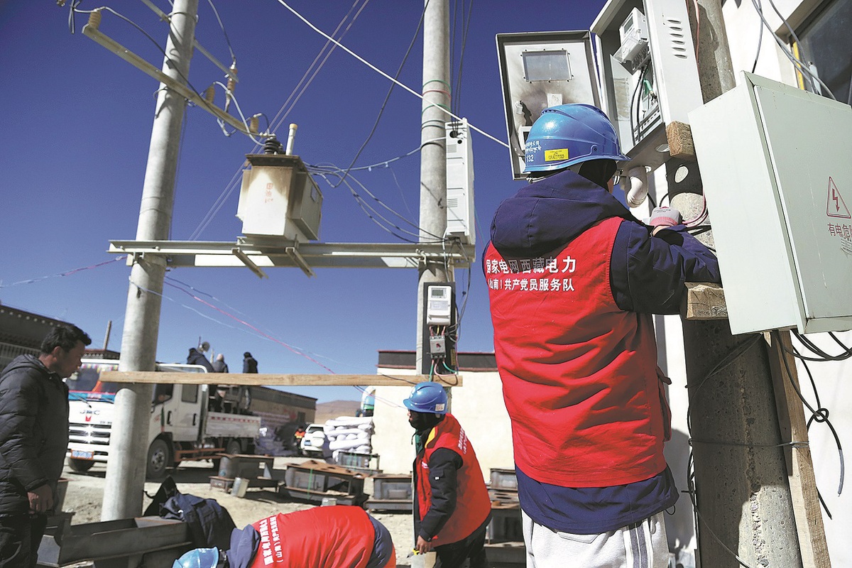 State Grid technicians check power transmission facilities at Thongley village on Thursday. (Da Qiong/China Daily)
