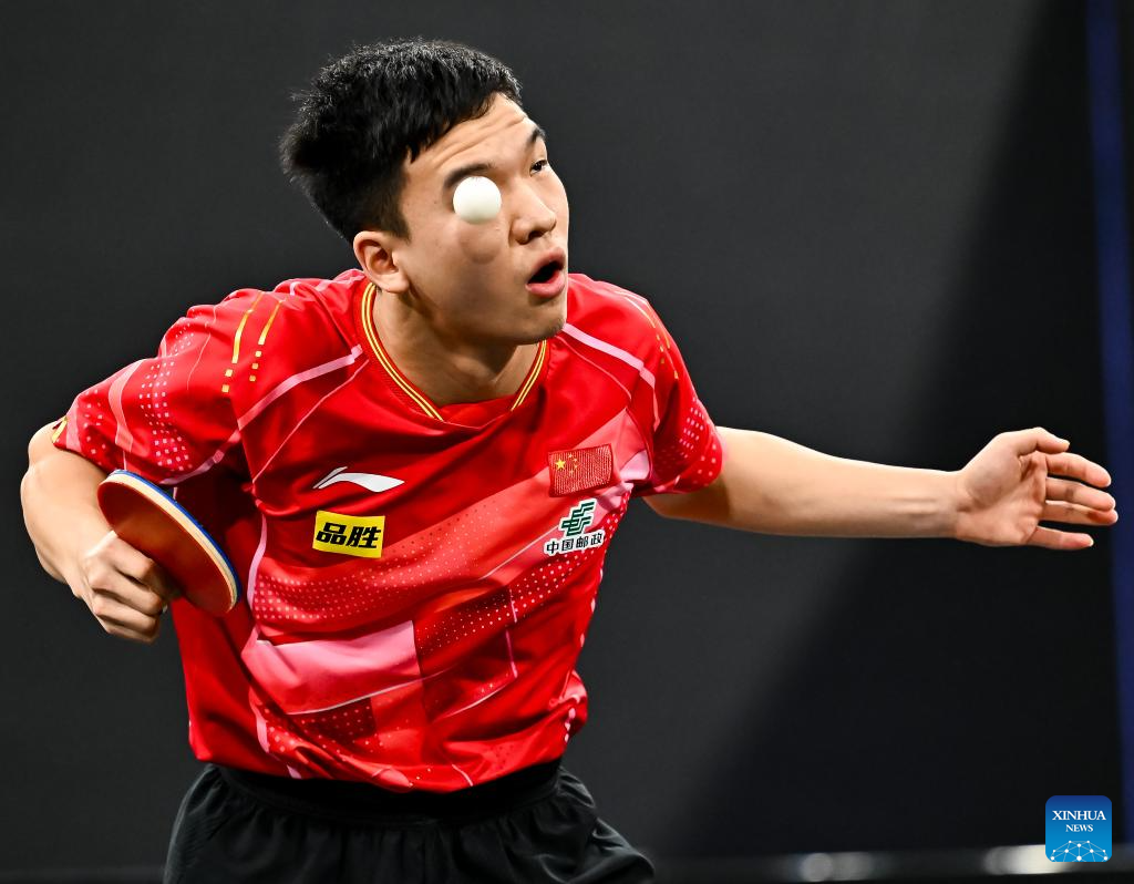 Xiang Peng of China hits a return during the men's singles round of 32 match between Xiang Peng of China and Tomas Polansky of the Czech Republic at WTT Star Contender Doha 2025 in Doha, Qatar, Jan. 9, 2025. (Photo by Nikku/Xinhua)
