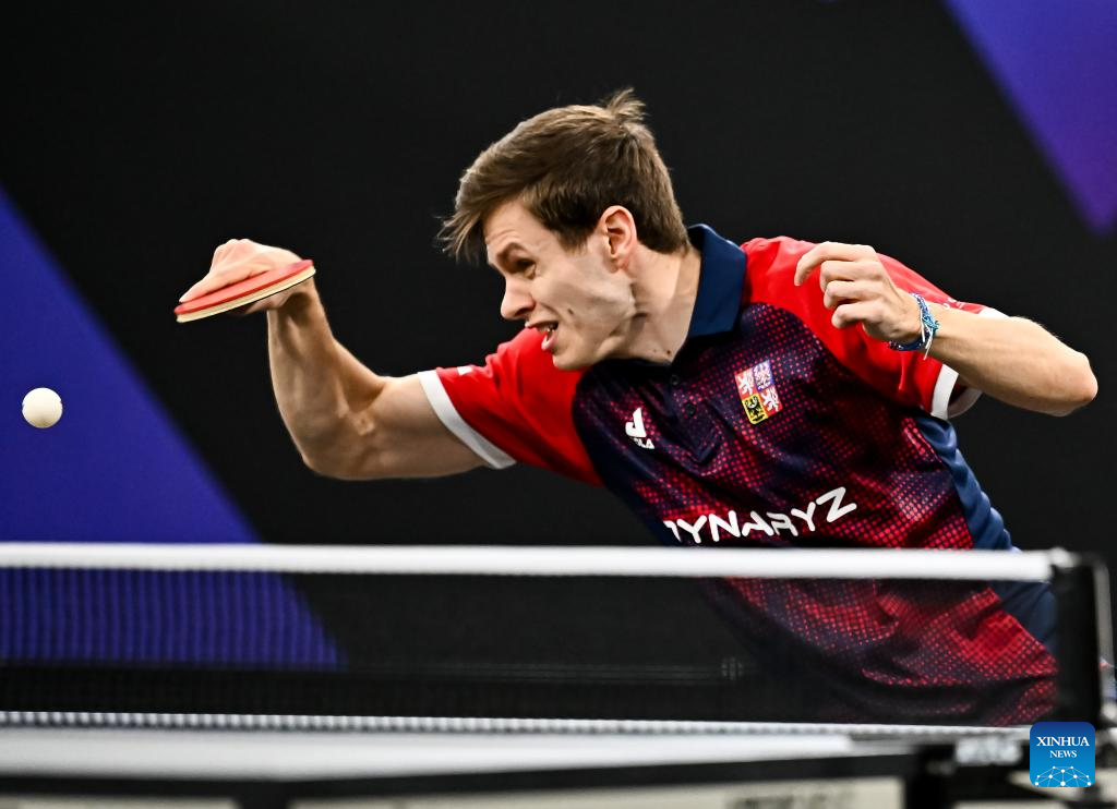 Tomas Polansky of the Czech Republic hits a return during the men's singles round of 32 match between Xiang Peng of China and Tomas Polansky of the Czech Republic at WTT Star Contender Doha 2025 in Doha, Qatar, Jan. 9, 2025. (Photo by Nikku/Xinhua)