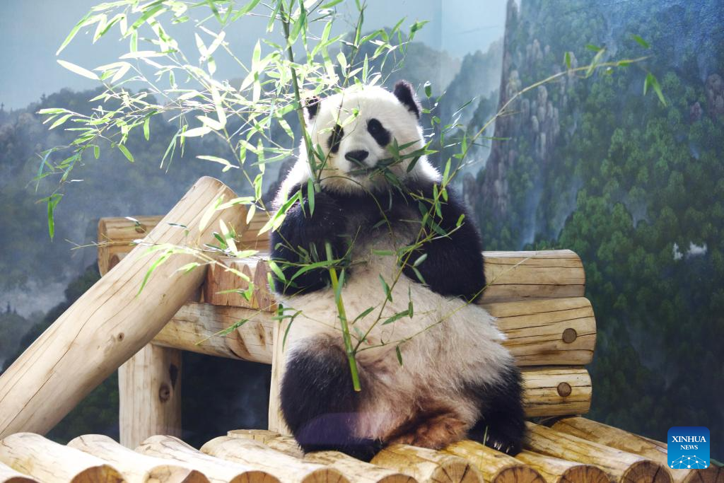 Female giant panda Qing Bao eats bamboo at the Smithsonian's National Zoo in Washington, D.C., the United States, on Jan. 9, 2025. The Smithsonian's National Zoo hosted a media preview event for Chinese media on Jan. 9, where giant pandas Bao Li and Qing Bao made their debut before the press. (Xinhua/Deng Xianlai)