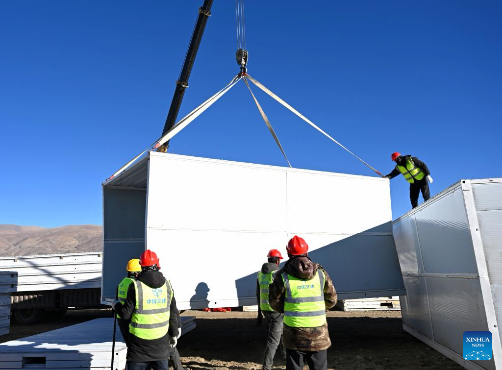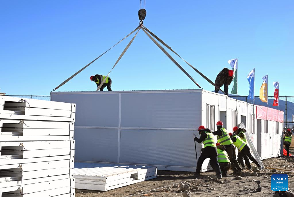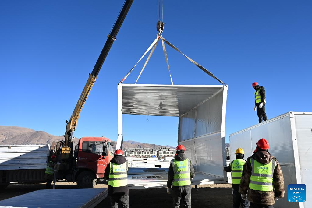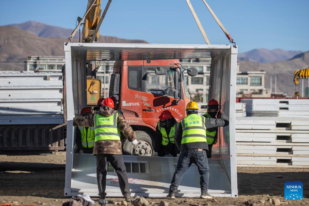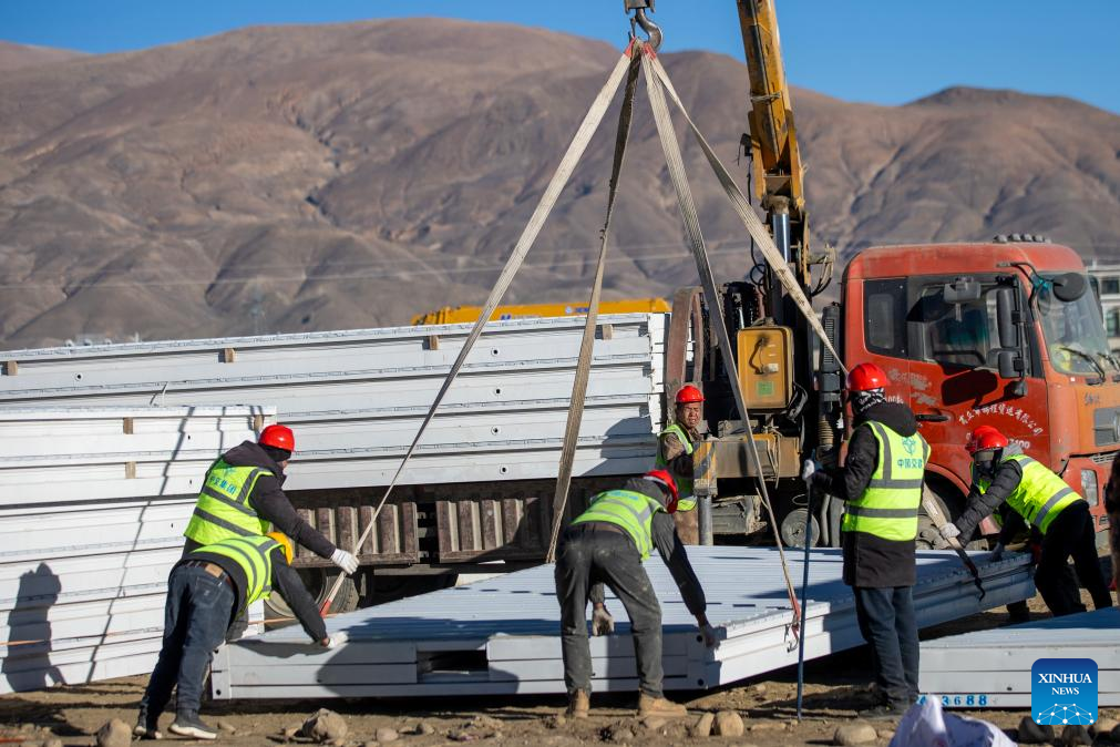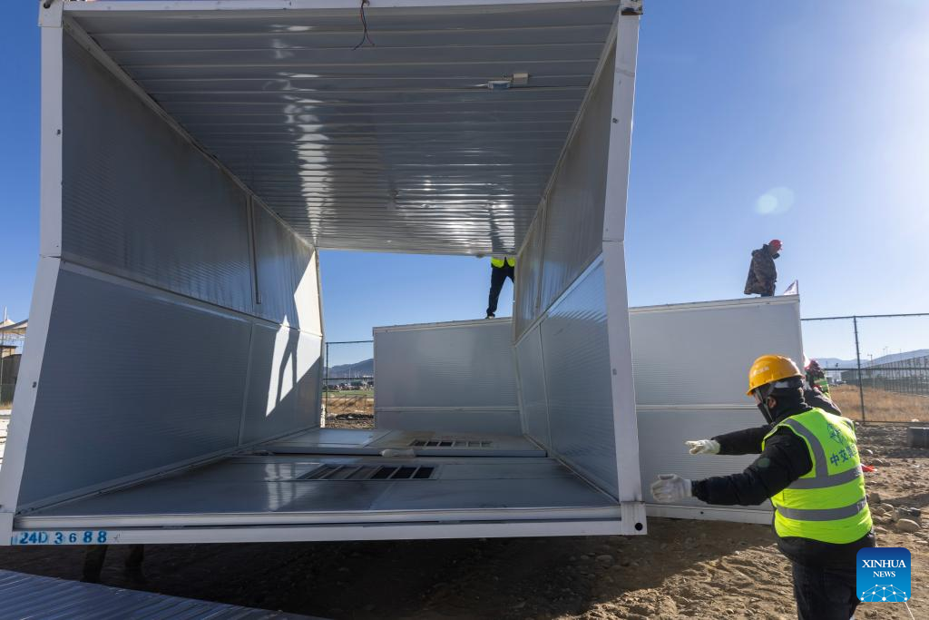 Workers build mobile houses in Quxar Township of Lnaze County in Xigaze, southwest China's Xizang Autonomous Region, Jan. 10, 2025. A total of 400 mobile houses started to be built here on Friday in quake affected Lnaza County as part of the disaster relief work after a 6.8-magnitude earthquake struck Dingri County in Xizang Autonomous Region on Tuesday morning. (Xinhua/Hu Xu)