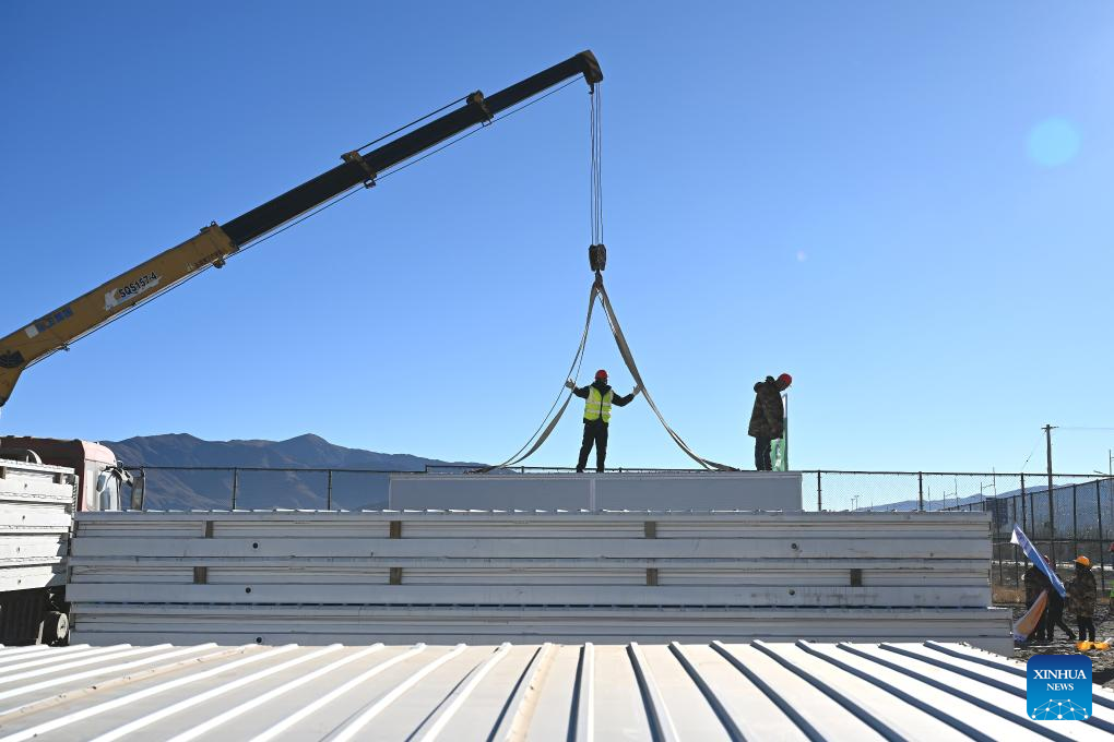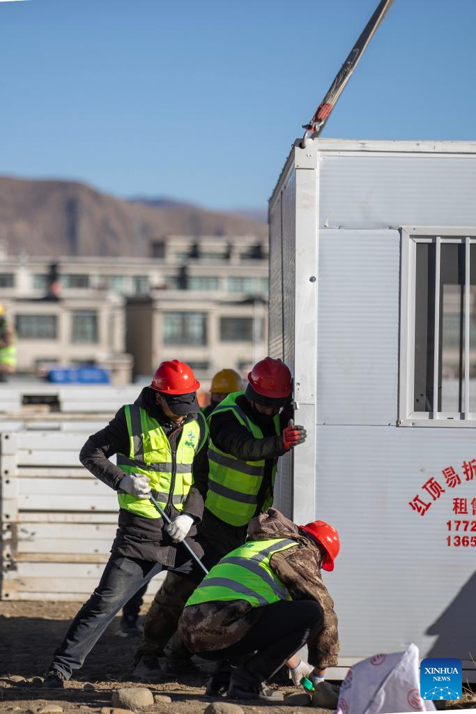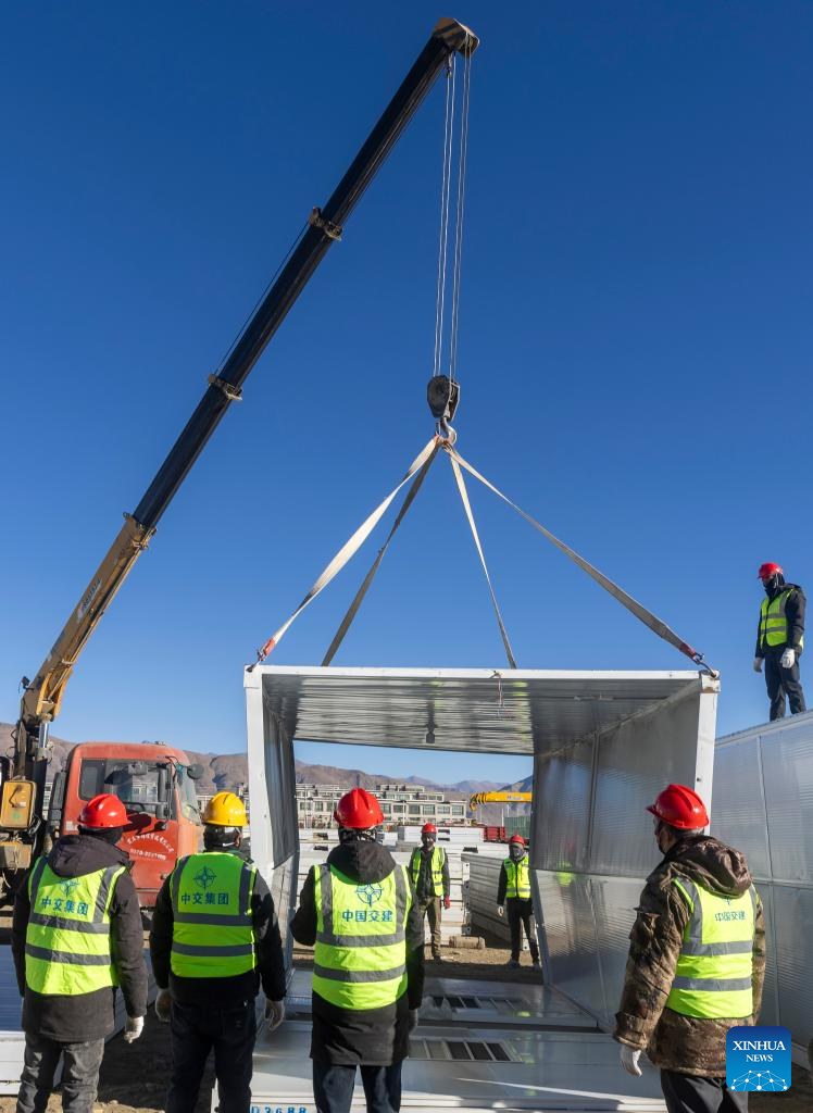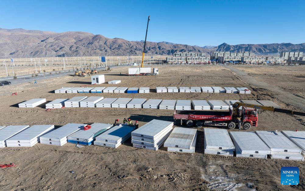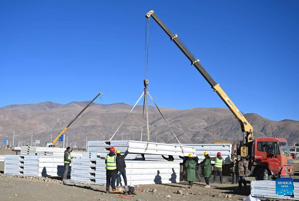 Workers build mobile houses in Quxar Township of Lnaze County in Xigaze, southwest China's Xizang Autonomous Region, Jan. 10, 2025. A total of 400 mobile houses started to be built here on Friday in quake affected Lnaza County as part of the disaster relief work after a 6.8-magnitude earthquake struck Dingri County in Xizang Autonomous Region on Tuesday morning. (Xinhua/Hu Xu)