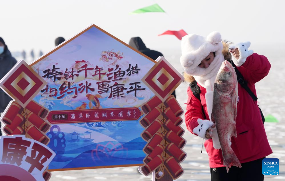 A tourist holds a fish to pose for photos at Wolong Lake in Kangping County of Shenyang, northeast China's Liaoning Province, Jan. 11, 2025. A winter fishing-themed cultural and tourism season began here on Saturday. (Xinhua/Li Gang)