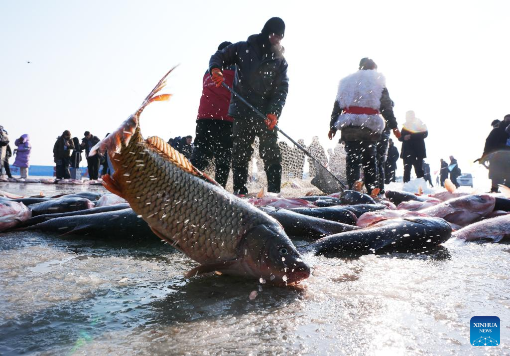 People catch fish at Wolong Lake in Kangping County of Shenyang, northeast China's Liaoning Province, Jan. 11, 2025. A winter fishing-themed cultural and tourism season began here on Saturday. (Xinhua/Li Gang)