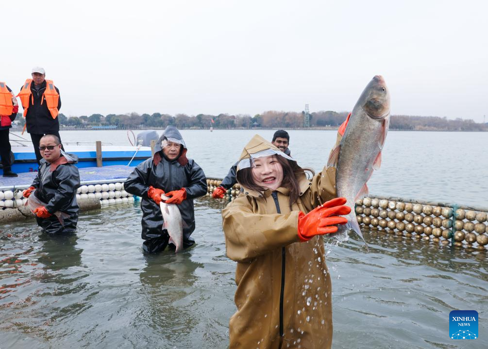 A tourist experiences fish catching during a winter fishing festival in Jiangyan District of Taizhou, east China's Jiangsu Province, Jan. 11, 2025. The winter fishing festival opened at Zhenhu Lake in Jiangyan District of Taizhou on Saturday. (Photo by Yan Yuming/Xinhua)