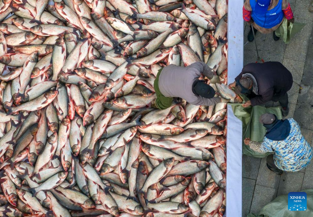 A drone photo shows people watching the freshly caught fish on the bank of Zhenhu Lake during a winter fishing festival in Jiangyan District of Taizhou, east China's Jiangsu Province, Jan. 11, 2025. The winter fishing festival opened at Zhenhu Lake in Jiangyan District of Taizhou on Saturday. (Photo by Gu Jihong/Xinhua)