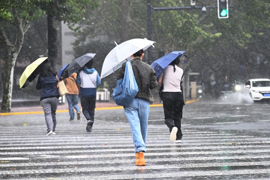 People walk across a street in the rain in Shanghai, east China, Nov. 1, 2024. (Photo by Chen Haoming/Xinhua)