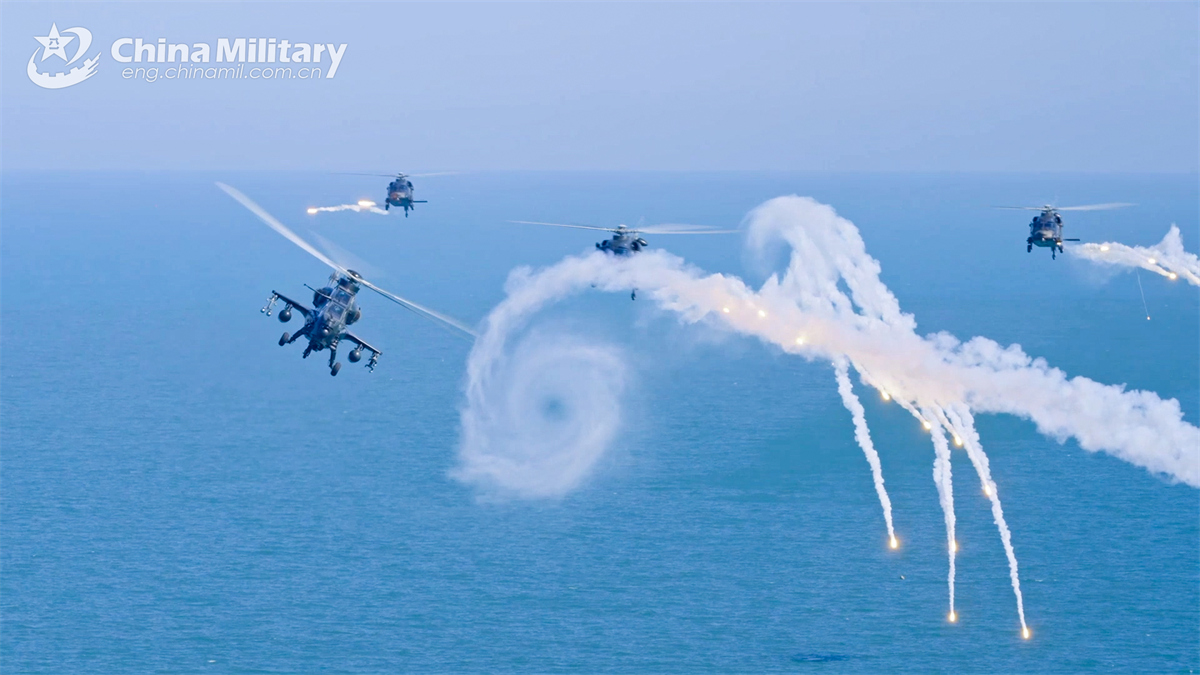 A group of attack helicopters attached to a brigade under the PLA 73rd Group Army fire off the defensive flare decoys during the ultra-low altitude defense penetration training on December 12, 2024. (eng.chinamil.com.cn/Photo by Zhang Renhao)
