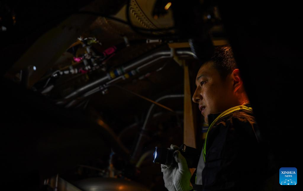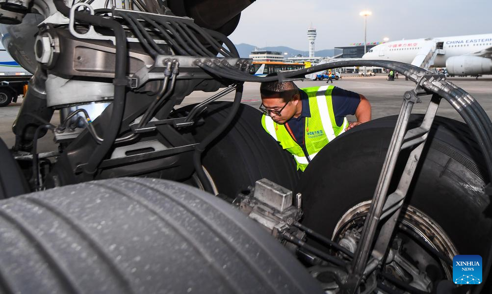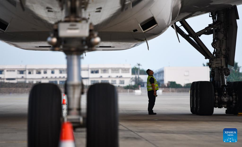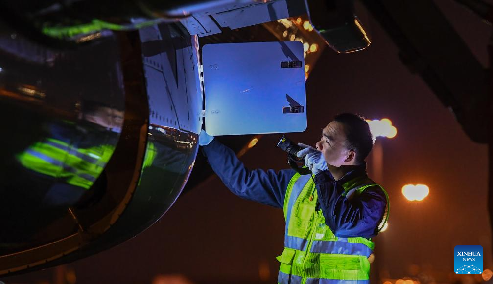 An engineer of China Southern Airlines checks an aircraft at the Meilan International Airport in Haikou, south China's Hainan Province, Jan. 11, 2025. As the Spring Festival travel rush approaches, China Southern Airlines has enhanced aircraft inspection and maintenance efforts to ensure the safe and reliable journeys for passengers. (Xinhua/Yang Guanyu)