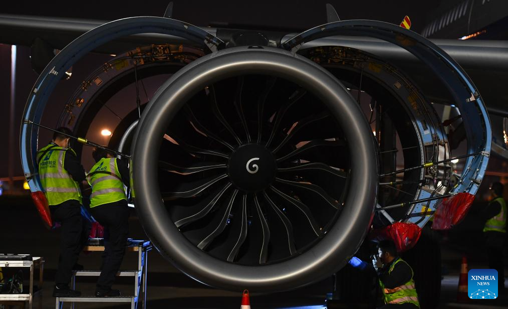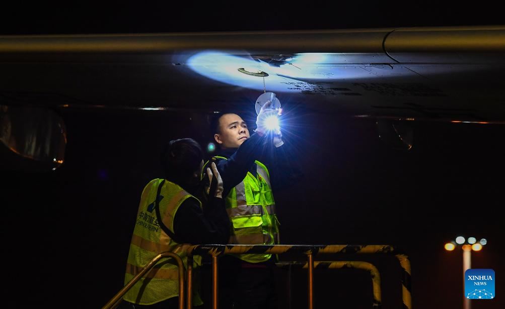 Engineers of China Southern Airlines check an aircraft at the Meilan International Airport in Haikou, south China's Hainan Province, Jan. 12, 2025. As the Spring Festival travel rush approaches, China Southern Airlines has enhanced aircraft inspection and maintenance efforts to ensure the safe and reliable journeys for passengers. (Xinhua/Yang Guanyu)