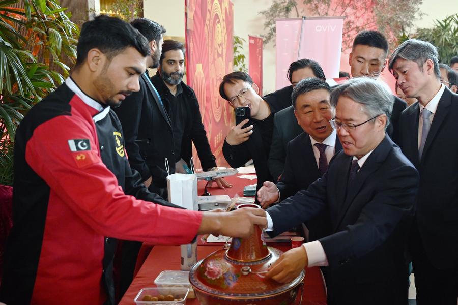 Chinese Ambassador to Pakistan Jiang Zaidong visits a stall during an event welcoming the Chinese New Year in Islamabad, capital of Pakistan, on Jan. 11, 2025. (Xinhua/Ahmad Kamal)