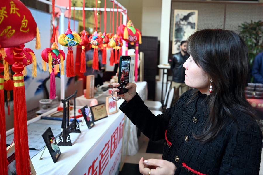 A woman visits a decorations stall during an event welcoming the Chinese New Year in Islamabad, capital of Pakistan, on Jan. 11, 2025. (Xinhua/Ahmad Kamal)