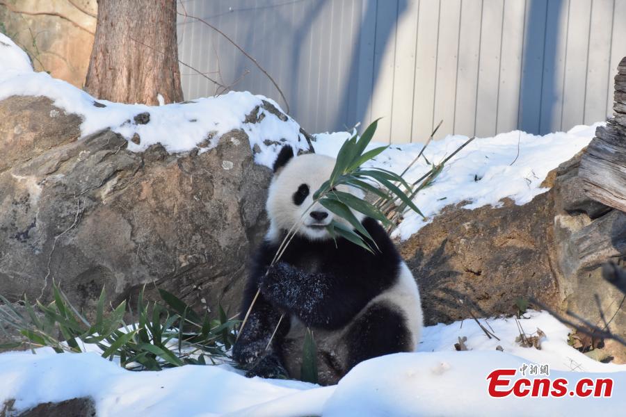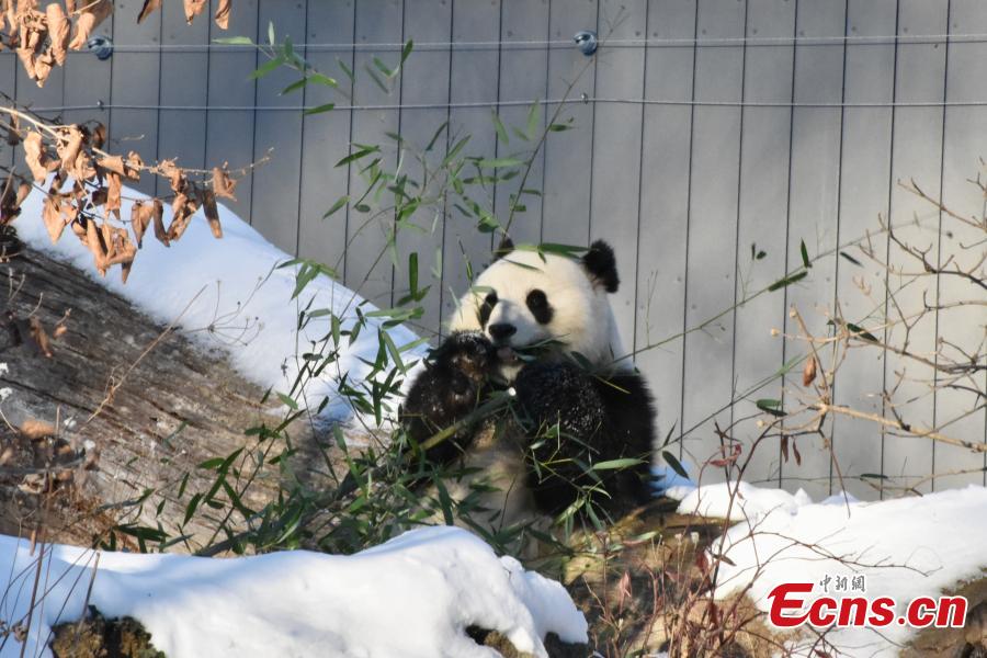 Female giant panda Qing Bao eats bamboo at the Smithsonian's National Zoo in Washington, D.C., the United States, Jan. 9, 2025. (China News Service/Shan Handing)