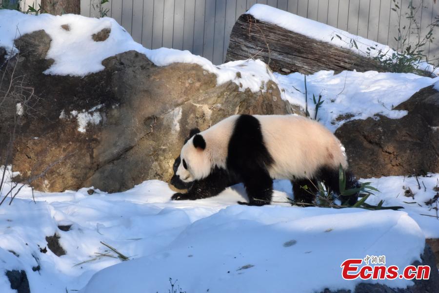 Female giant panda Qing Bao plays at the Smithsonian's National Zoo in Washington, D.C., the United States, Jan. 9, 2025. (China News Service/Shan Handing)