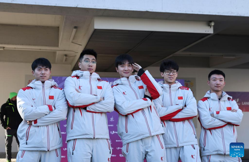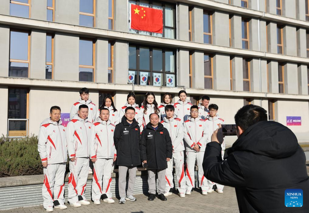 Members of the Chinese curling team pose for photos during the welcoming ceremony at FISU Games Village of Torino 2025 in Turin, Italy, Jan. 13, 2025. (Xinhua/Li Jing)