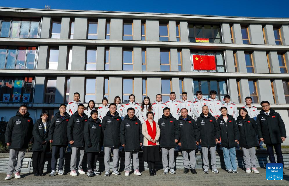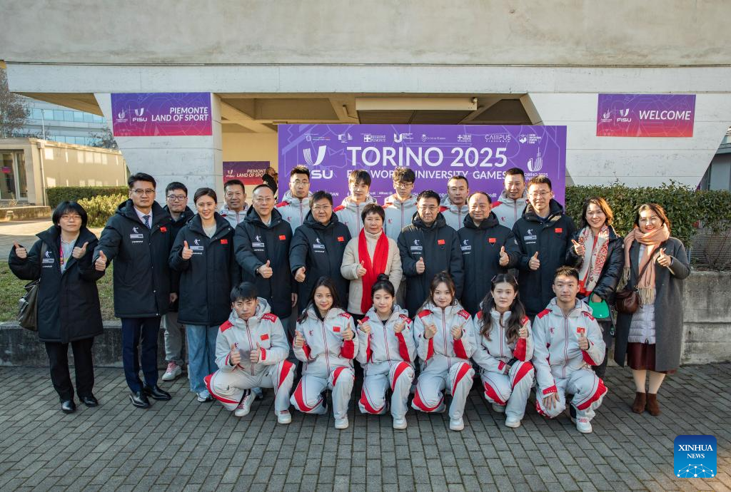 Members of Chinese delegation pose for photos during the welcoming ceremony at FISU Games Village of Torino 2025 in Turin, Italy, Jan. 13, 2025. (Xinhua/Li Jing)