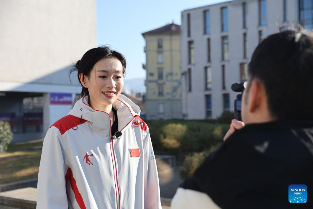 Chinese curling player Pei Junhang speaks to the press during the welcoming ceremony at FISU Games Village of Torino 2025 in Turin, Italy, Jan. 13, 2025. (Xinhua/Li Jing)