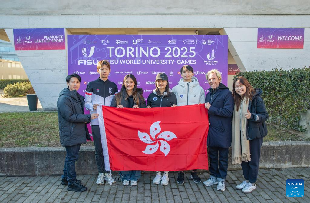 Members of China's Hong Kong delegation pose for photos during the welcoming ceremony at FISU Games Village of Torino 2025 in Turin, Italy, Jan. 13, 2025. (Xinhua/Zhang Fan)