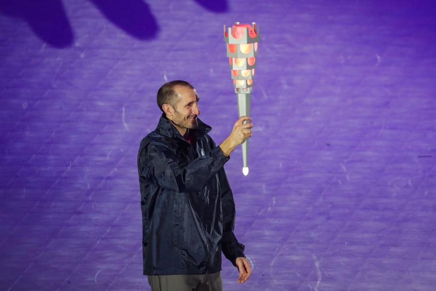 Former Italian football player Giorgio Chiellini holds the torch during the opening ceremony of the 2025 FISU Winter World University Games in Turin, Italy, Jan. 13, 2025. (Xinhua/Zhang Fan)