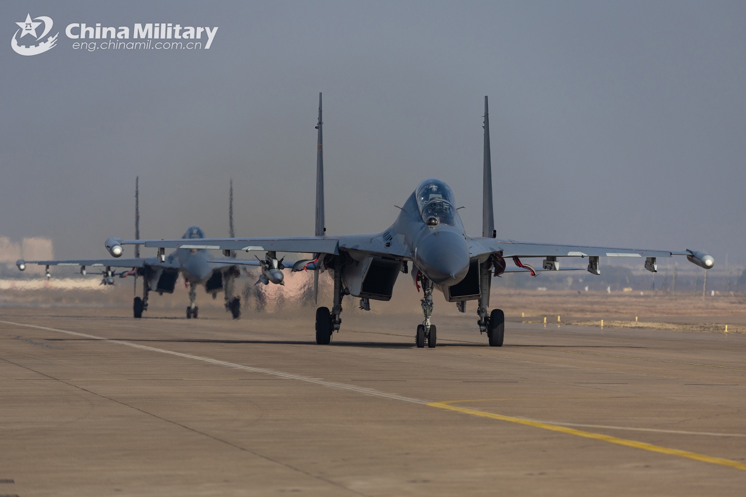 Su-30 fighter jets attached to a brigade with the air force under Chinese PLA Eastern Theater Command taxi on the runway during a flight training exercise, on January 4, 2025. (eng.chinamil.com.cn/Photo by Huang Guotai)