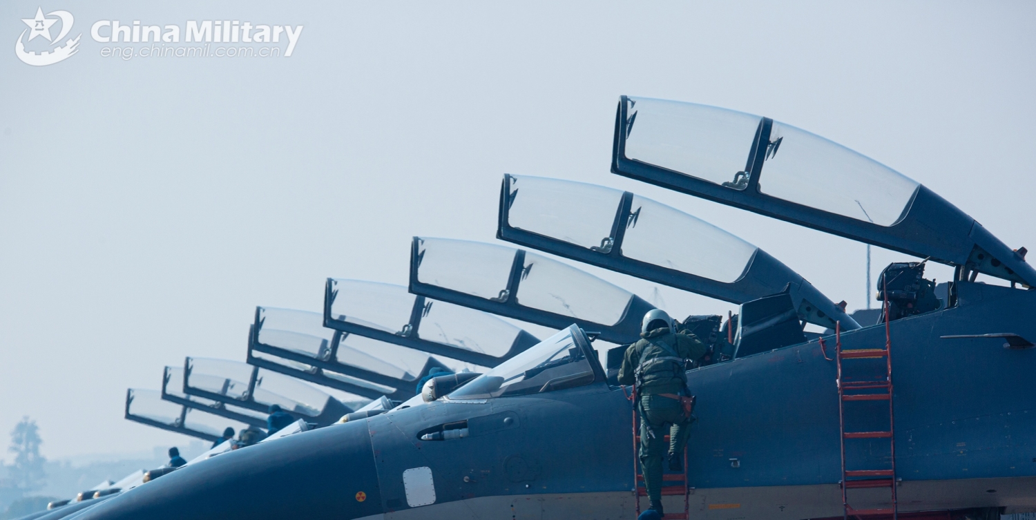 A pilot assigned to a brigade with the air force under Chinese PLA Eastern Theater Command climbs into the cockpit of his SU-30 fighter jet during a flight training exercise on January 4, 2025. (eng.chinamil.com.cn/Photo by Huang Guotai)